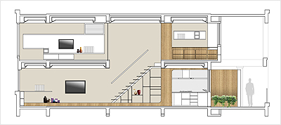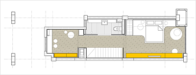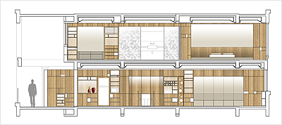 設(shè)計師在一樓及二樓分別設(shè)置了兩面“功能墻”。居住所需的各種不同功能被植入墻體內(nèi),或從墻體內(nèi)延伸,這些功能包括了儲藏柜,工作臺,展示架,書架,酒柜,餐桌,沙發(fā)。。。 等。