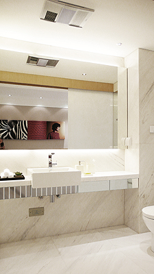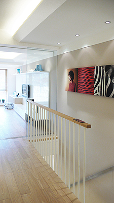 二樓衛(wèi)生間與過道的分隔墻采用白色的不透明夾膠玻璃,玻璃表面印制花紋。這樣的處理方式不但能夠節(jié)省空間,并能夠賦予原本較平淡的過渡空間更多的設(shè)計感。玻璃移門能夠左右移開,讓衛(wèi)生間與過道成為一個整體空間,增加戶型更加通透及開放的生活特性;