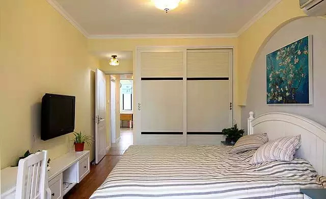 主臥,我們把衣柜的空間往小房間推了,并且把陽臺(tái)包了進(jìn)來,這樣看著是不是感覺不小啊。