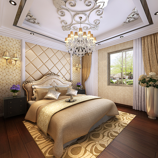 主臥很漂亮,設(shè)計師設(shè)計的床頭背景很大氣,中間做的軟包,兩邊的石膏板造型中間貼上壁紙,磅礴大氣。墻面簡單直接貼墻紙,因為主臥較大,所以設(shè)計師在中間用鏤空花格做隔斷裝飾,風格出一個書柜、衣柜的空間,臥室的大窗戶采光是非常好的。